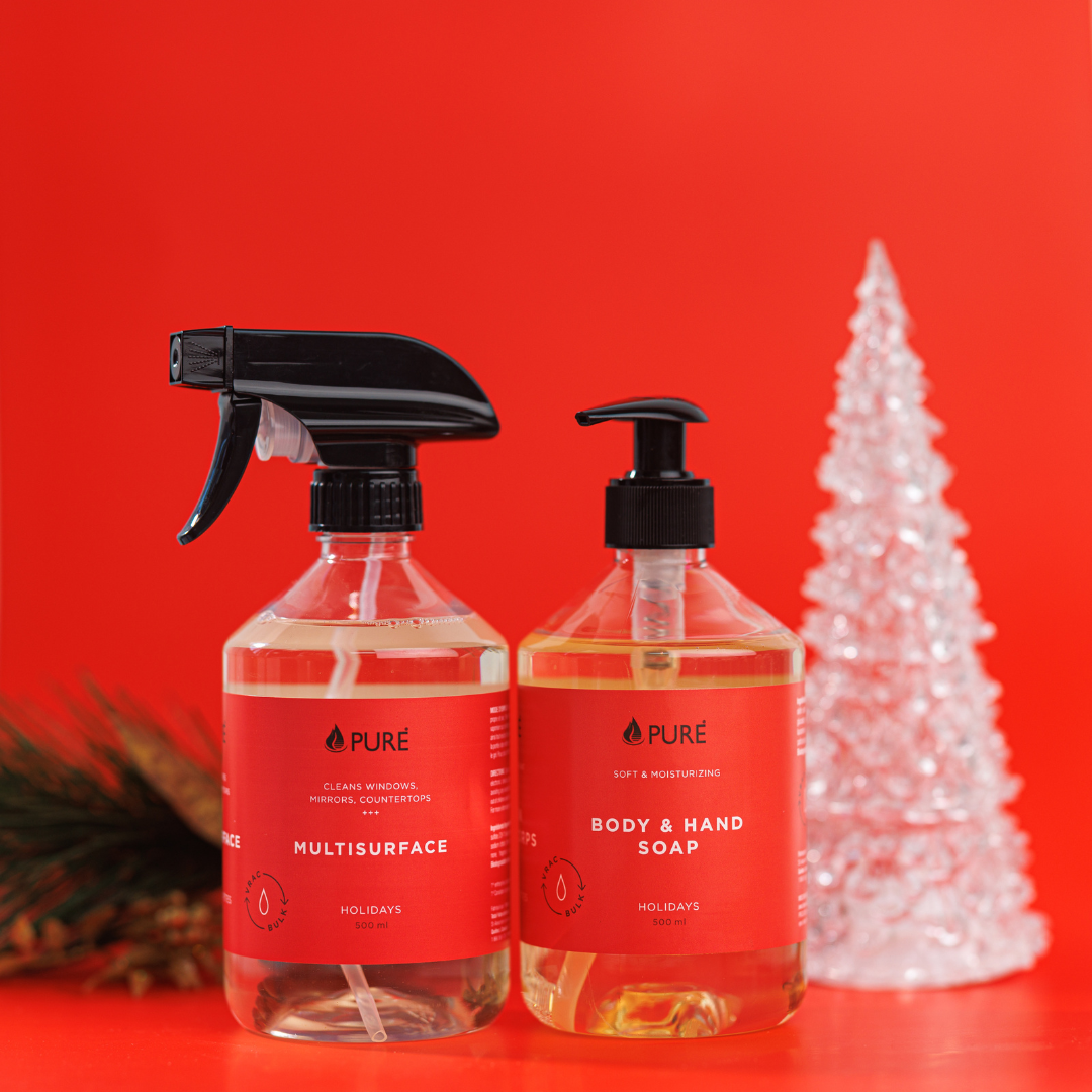 Retrouvez ici notre duo arôme Temps des fêtes incluant le savon mains corps ainsi que le nettoyant multisurface, tous offerts pour une durée limitée. Ce sont des effluves réconfortants d’aiguilles de pins, de canneberge et de cannelle qui composent cet arôme festif, digne des célébrations traditionnelles. Une belle manière de rendre le ménage beaucoup plus attrayant en vue des partys du temps des fêtes !