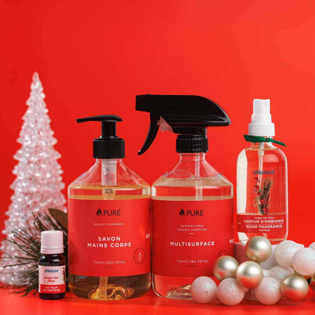Notre collection des fêtes se déclinant en quatre produits distincts, soit le parfum d’ambiance, extrait de senteur, le savon mains corps ainsi que le nettoyant multisurface, tous offerts pour une durée limitée. Ce sont des effluves réconfortants d’aiguilles de pins, de canneberge et de cannelle qui composent cet arôme festif, digne des célébrations traditionnelles. Une belle manière de rendre le ménage beaucoup plus attrayant en vue des partys du temps des fêtes !