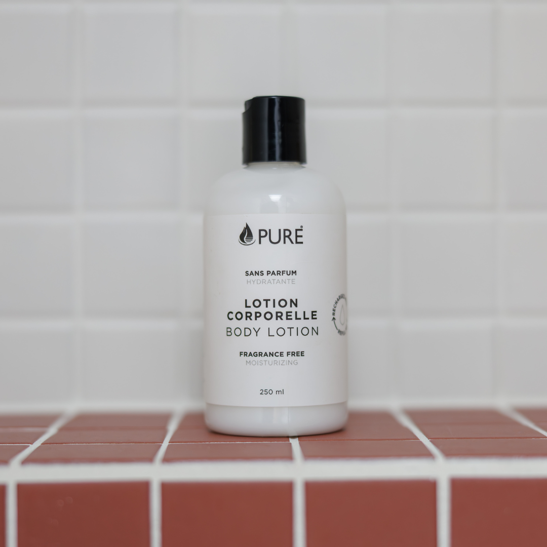 Pour le plus grand bonheur de toutes les peaux sensibles, la formule hydratante de la lotion corporelle  est faite à 98,9% d’ingrédients d’origine naturelle. Ce produit est très polyvalent, parfaite après le bain pour votre bébé et excellent sur les coups de soleil. La lotion sans parfum ne donne pas un fini gras, elle pénètre très bien la peau et hydrate en profondeur. Fabriqué à notre usine Total Fabrication, ce produit est rechargeable.