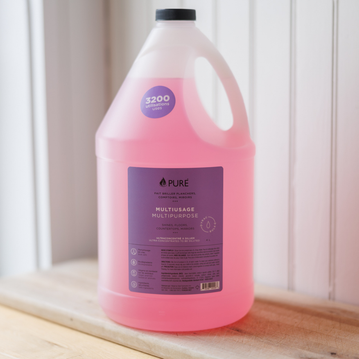 À base d’ingrédients naturels comme l’eau de rose, le multiusage ultraconcentré affiche une redoutable efficacité, tant à l’intérieur qu’à l’extérieur de la maison! Reconnu sous le nom du produit rose, il est un essentiel dans une maison! La liste est longue de tout ce que le multiusage peut laver : plancher, vitre, comptoir, escalier, déco, auto, bateau, kayak, paddleboard, etc!
