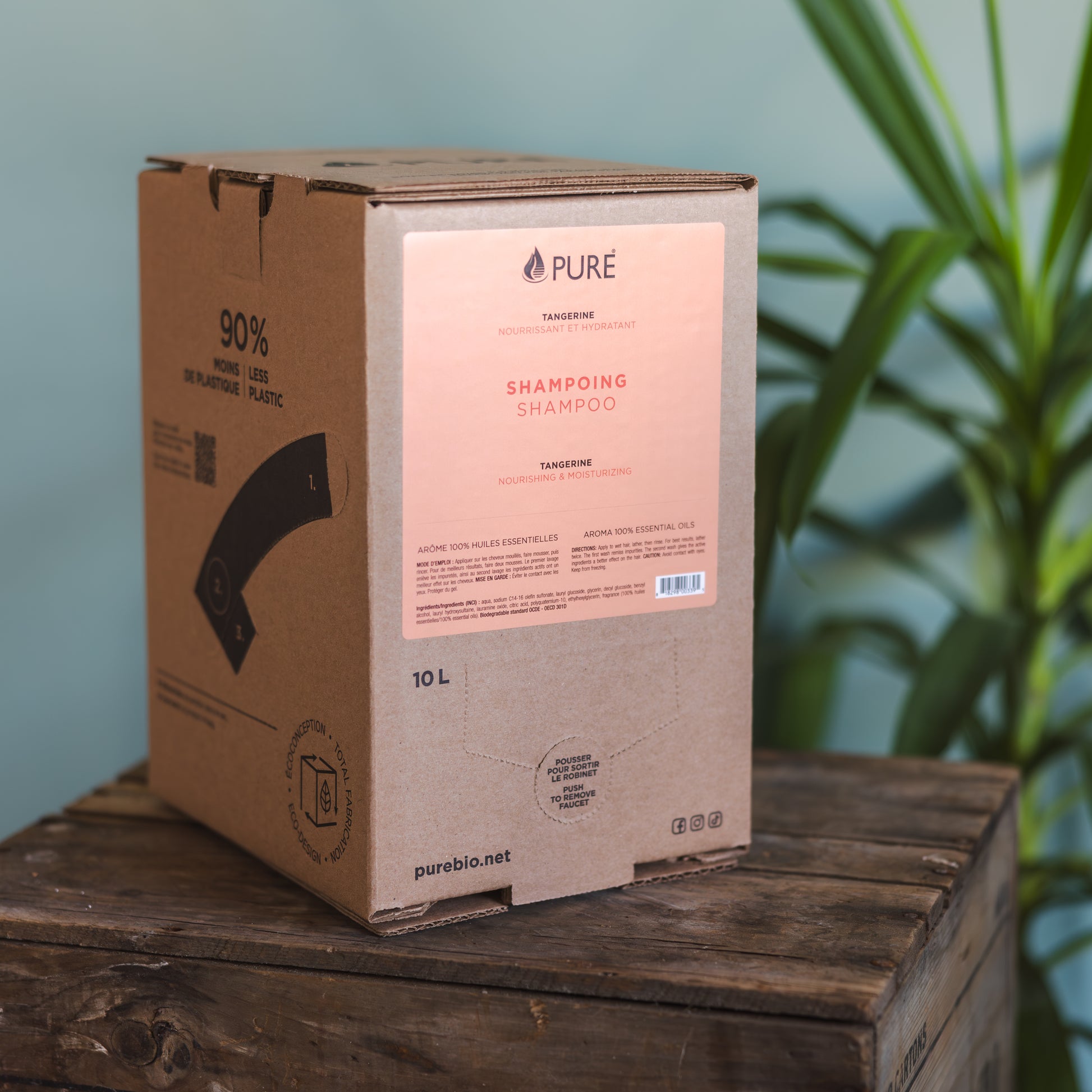 Le Shampoing de Pure est biodégradable et son arôme est issu à 100% d’huile essentielle de tangerine. Pas besoin d’ajouter du revitalisant à votre routine, sa formule 2 dans 1 est déjà complète. Sa mousse riche hydrate tous les types de cheveux et prend soin du cuir chevelu. Il donnera à votre chevelure volume et brillance. Vous allez pouvoir afficher la confiance et le bonheur des tops modèles qui ont les cheveux dans le vent... S’agit juste de trouver les projecteurs et les ventilateurs… Sinon pour le shampoing au moins c’est simple: vous le trouverez au magasin de vrac près de chez vous.